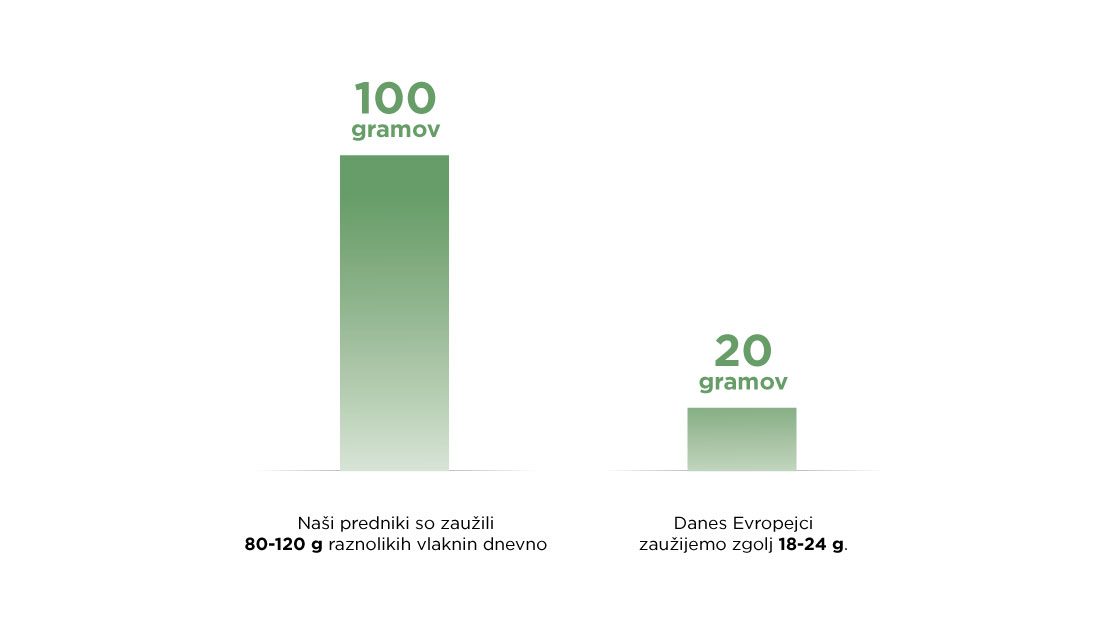Danes povprečen Evropejec zaužije približno 18–24 gramov vlaknin dnevno. To je približno 20% tistega, kar je naše telo več tisočletij dobivalo in hkrati tudi pod trenutnimi priporočili 25–30 gramov dnevno za odrasle.