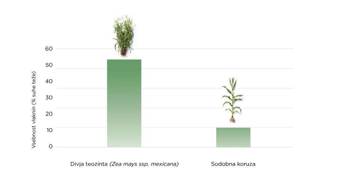 Vsebnost vlaknin: divja teozinta (Zea mays ssp. mexicana – prednik koruze) v primerjavi s sodobno koruzo. Divja zrna teozinte (če jih merimo skupaj z njihovimi vlaknastimi zunanjimi ovoji) vsebujejo približno 55 % prehranskih vlaknin (na suho težo), predvsem zaradi trdnih zaščitnih struktur. Nasprotno pa sodobna polnozrnata koruzna moka običajno vsebuje okoli 7–10 % prehranskih vlaknin. Ta premik odraža selektivno žlahtnjenje za večja, mehkejša in s škrobom bogatejša zrna z zmanjšanim deležem vlaknin.