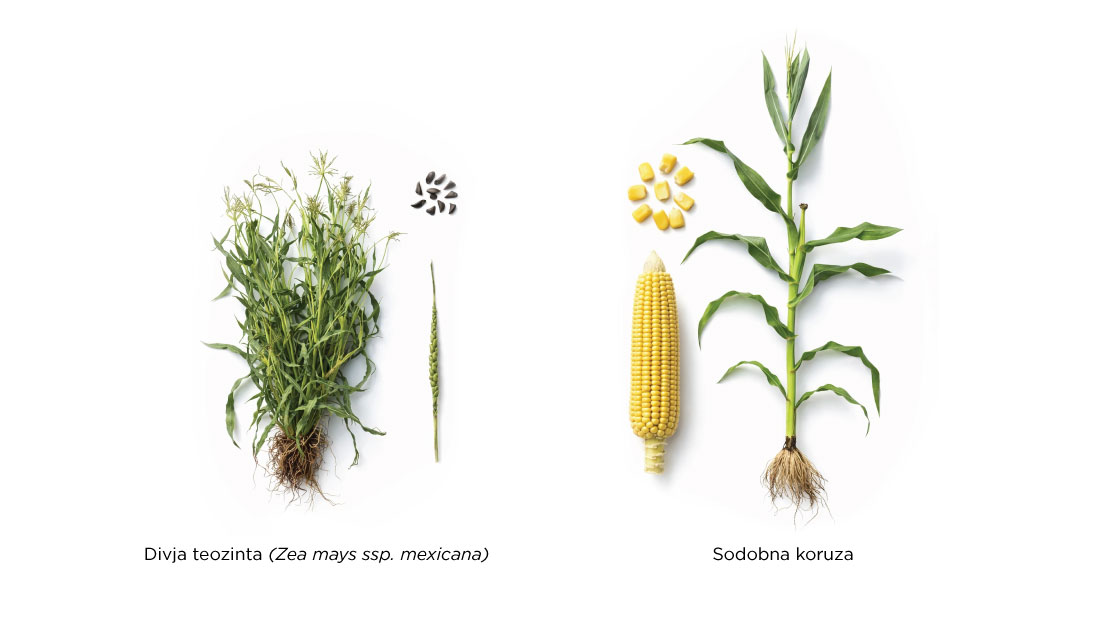 Divja teozinta (Zea mays spp. mexicana) v primerjavi s sodobno koruzo. Prirejeno po: Ancient Maize Yields Clues to More Resilient Corn, American Scientist.
